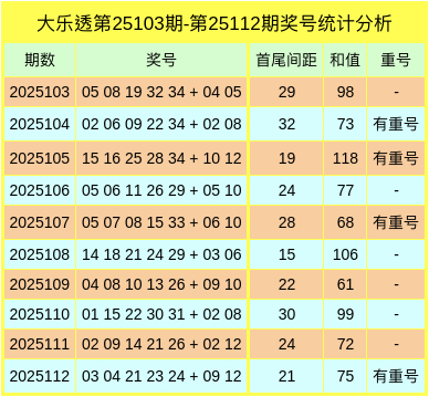 上期前区和值为75,开出1枚重号21,开出4枚连号03,04,23,24,首尾间距为21。